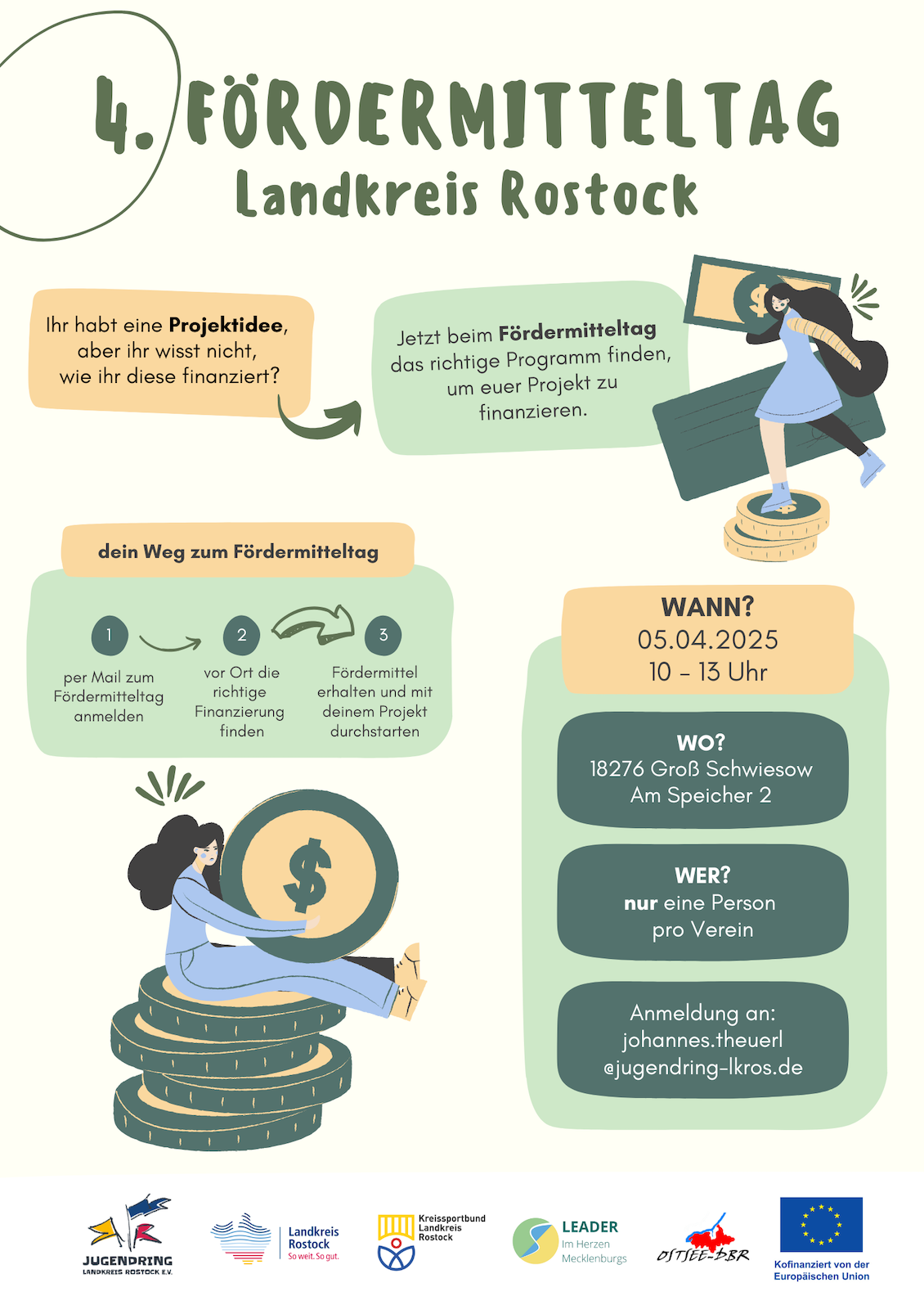 Am 5. April 2025 findet von 10 bis 13 Uhr in Groß Schwiesow, Am Speicher 2, der 4. Fördermitteltag für den Landkreis Rostock statt. Organisiert wird der Fördermitteltag vom Jugendring Landkreis Rostock. Der Landkreis beteiligt sich.