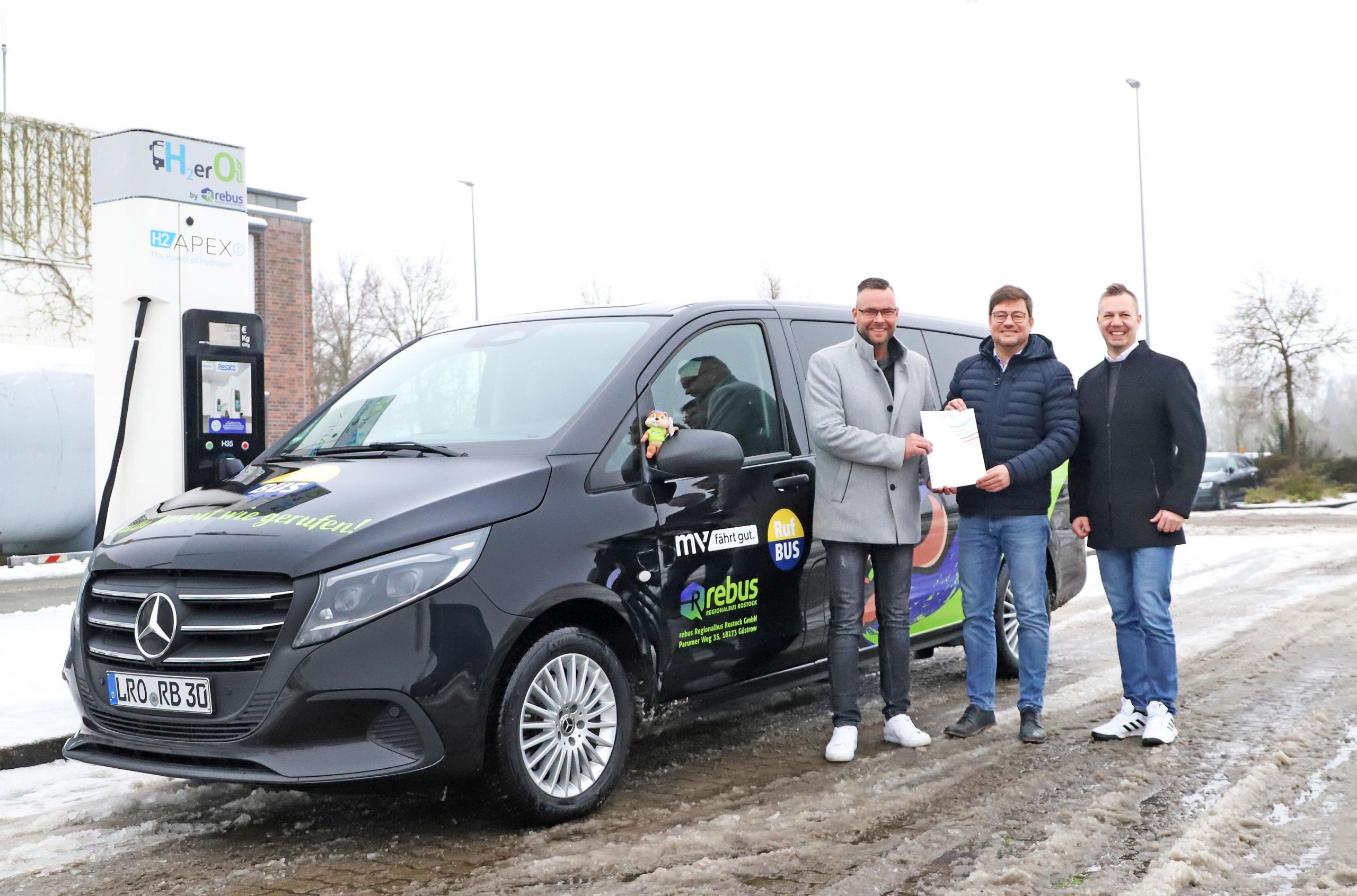 Die rebus Regionalbus Rostock GmbH baut ihr 2021 gestartetes Rufbusangebot im Landkreis Rostock weiter aus und setzt damit konsequent auf eine verlässliche Mobilität in der Fläche. Der Landrat des Landkreises Rostock, Sebastian Constien, hat für die Anschaffung von sechs weiteren Rufbussen des Typs Mercedes-Benz Vito einen Fördermittelbescheid an rebus-Geschäftsführer Thomas Nienkerk übergeben. Mit der Erweiterung umfasst die rubi-Flotte nun insgesamt 21 Fahrzeuge.