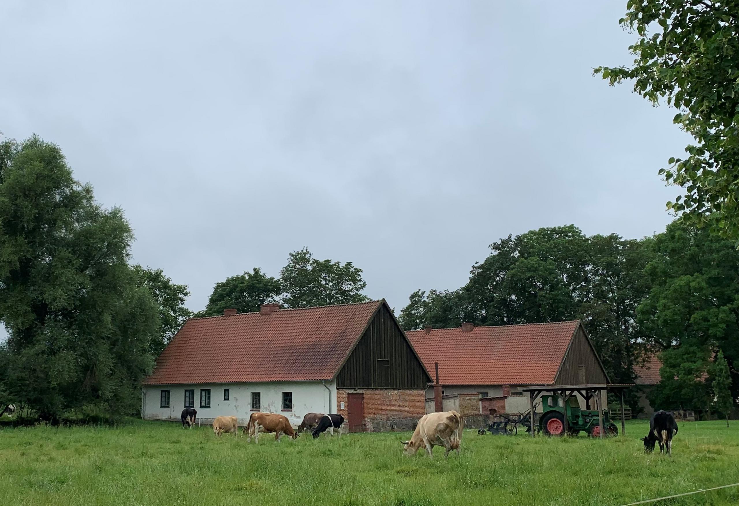 … das sind jetzt wohl erst einmal die Rinder. Friedlich grasen Bauer Bahls‘ Milchkühe vor dem musealen Gebäudekomplex der Neubauernhäuser auf dem Tellower Gutshof.